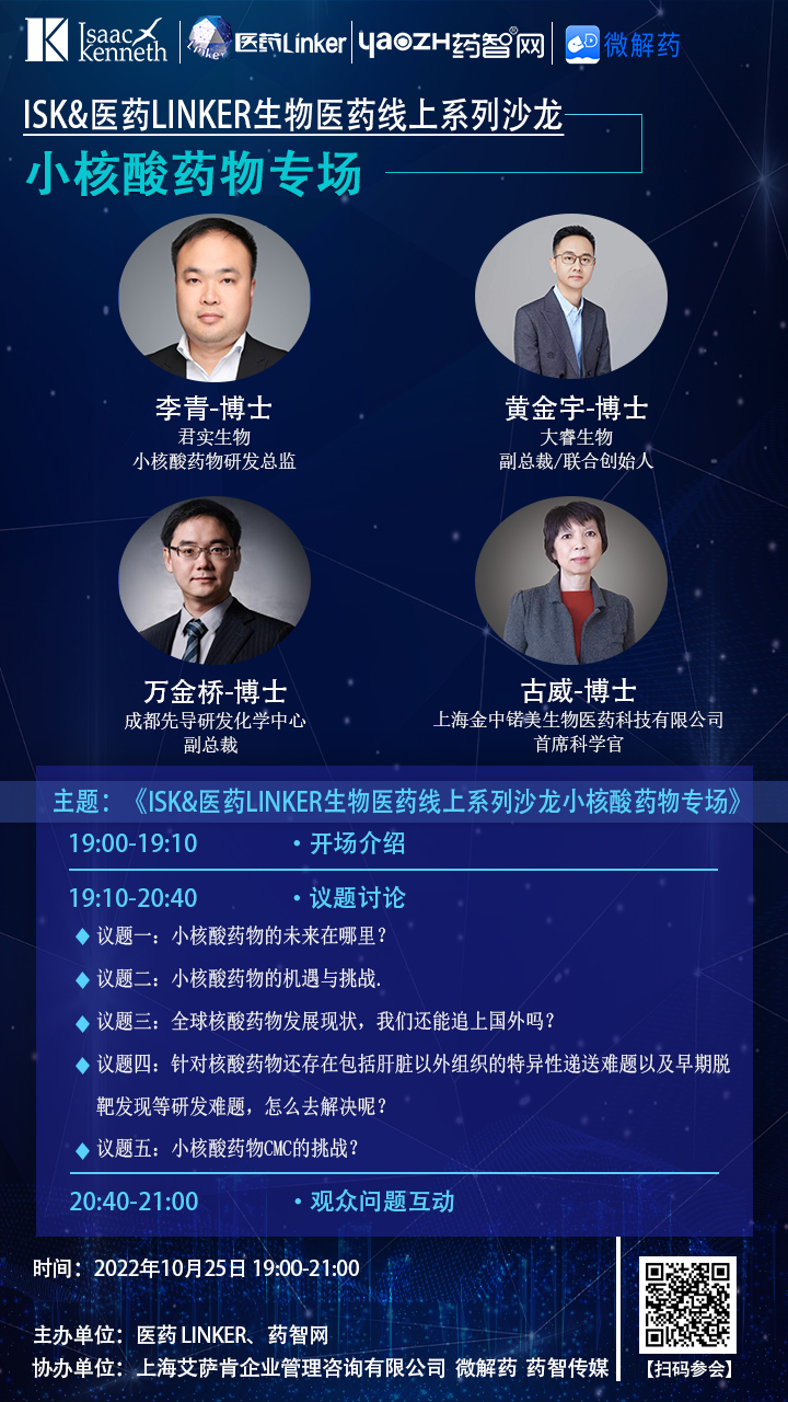2022年10月25日,ISK&醫(yī)藥Linker線上系列沙龍第一期——小核酸藥物專場(chǎng)圓滿舉辦