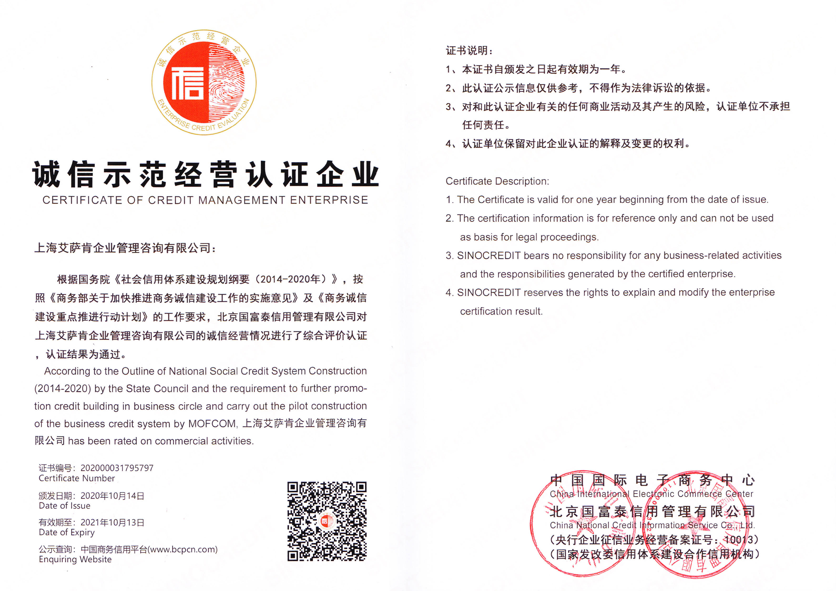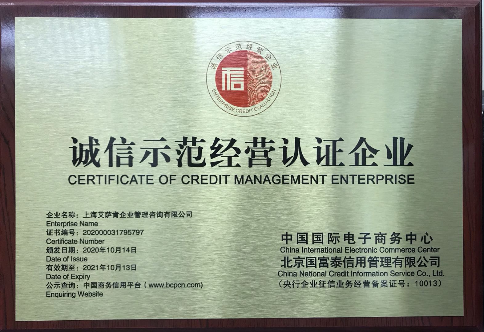 根據(jù)國務(wù)院《社會信用體系建設(shè)規(guī)劃綱要(2014-2020年)》,按照《商務(wù)部關(guān)于加快商務(wù)誠信建設(shè)工作的實施意見》及《商務(wù)誠信建設(shè)重點推進行動計劃》的工作要求,北京國富泰信用管理有限公司對上海艾薩肯企業(yè)管理咨詢有限公司(ISK)的誠信經(jīng)營情況進行了綜合評價認證,認證結(jié)果為通過,并于10月14日正式頒發(fā)證書并于“中國商務(wù)信用平臺(www.bcpcn.com)”公示。